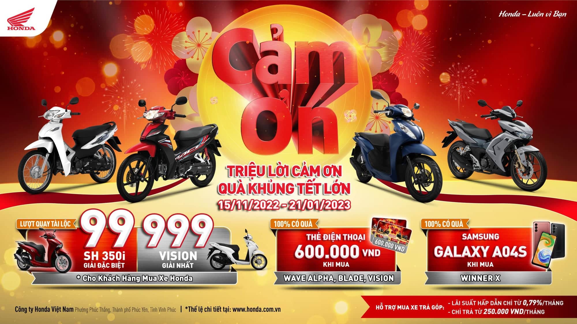Chương trình “Triệu lời cảm ơn – Quà khủng Tết lớn” được triển khai đồng thời với hai nội dung khuyến mại: Quay thưởng may mắn cho tất cả khách hàng mua xe Honda với 99 Giải Đặc biệt – mỗi giải là 1 xe SH350i đẳng cấp, 999 giải Nhất – mỗi giải là 1 xe Vision sành điệu và tặng quà tri ân với hàng trăm ngàn phần quà hấp dẫn khác dành riêng cho khách hàng mua xe Winner X, Vision, Wave Alpha, và Blade dịp Tết 2023.