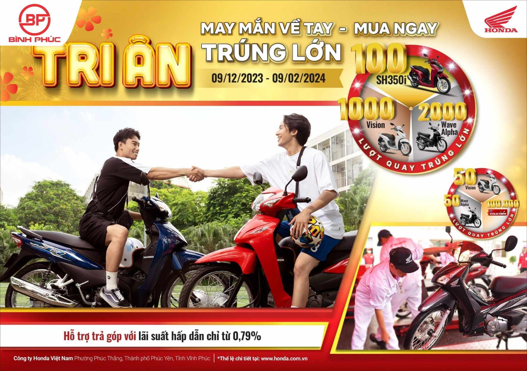 Đối với khách hàng mua Wave Alpha, Blade, Wave RSX, Future, Vision, Air Blade 125/150/160, LEAD, Sh mode: với mỗi sản phẩm đã mua tại HEAD hoặc các cửa hàng bán xe máy tổng hợp trên toàn quốc khách hàng sẽ được tham gia quay thưởng may mắn với cơ hội trúng giải thưởng đặc biệt hoành tráng:
