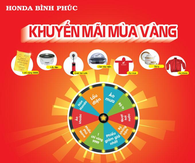 Khách hàng khi mua xe tại các cửa hàng thuộc hệ thống Honda Bình Phúc sẽ được tặng 01 nón bảo hiểm và cơ hội nhận thêm 01 phần quà hấp dẫn như: 01 Chỉ vàng 999.9, Quạt hơi nước, Lẩu điện, Áo khoác, Áo mưa.....