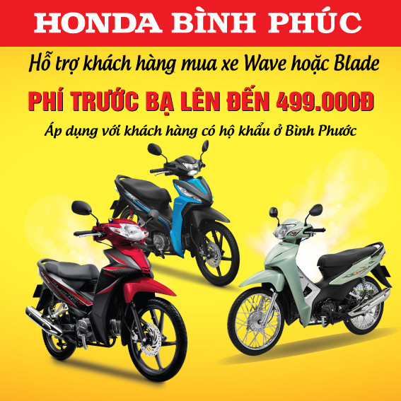 HEAD Bình Phúc thực hiện chương trình khuyến mãi. Mua xe Blade hoặc Wave được hỗ trợ trước bạ lên đến 499.000Đ đối với khách hàng mua xe có hộ khẩu ở TỈnh Bình Phước