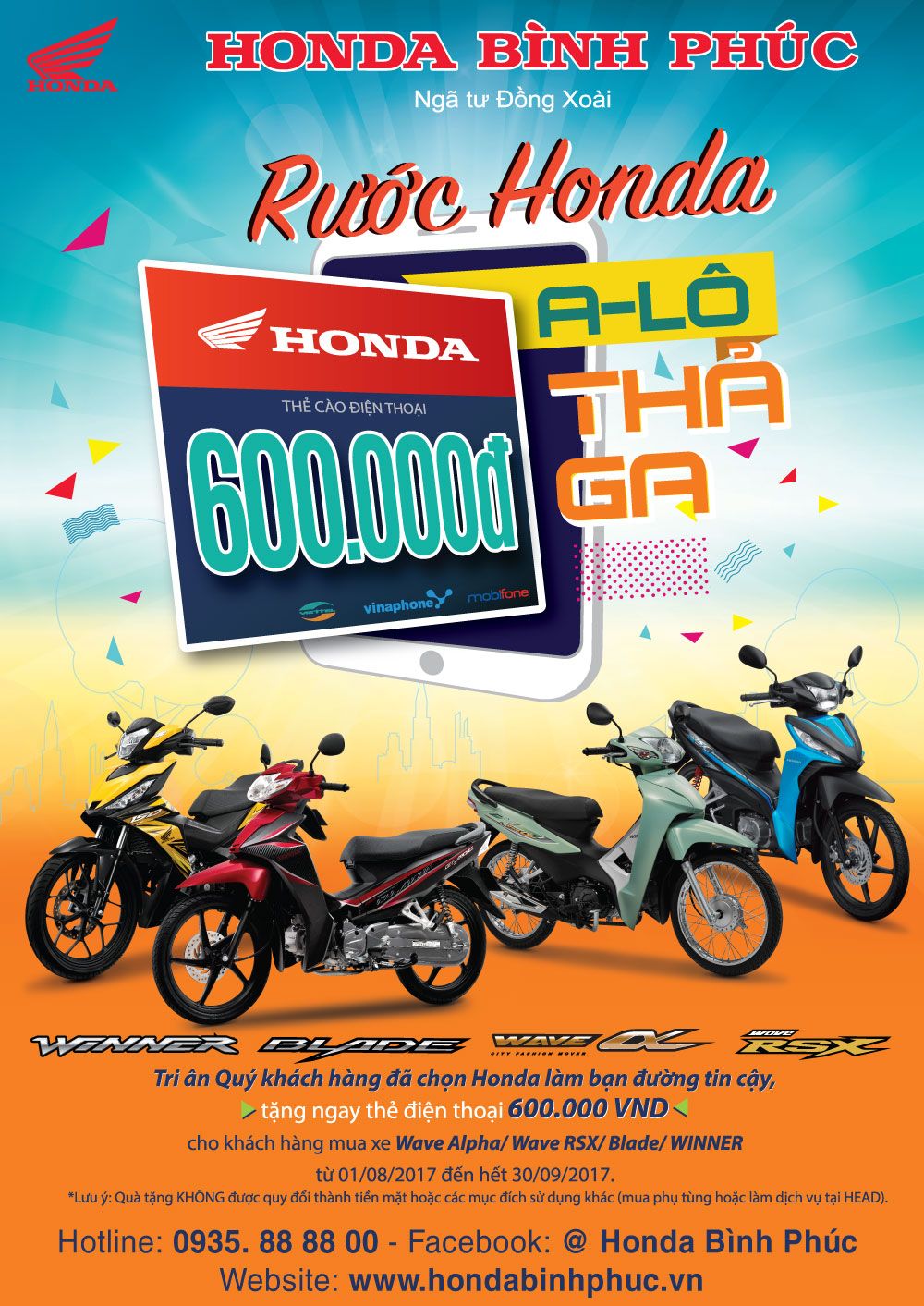 Với mong muốn đem đến cơ hội sở hữu những sản phẩm chất lượng cao và nhân thêm niềm vui mua sắm cho khách hàng, Honda Việt Nam thực hiện chương trình tri ân khách hàng “Rước Honda, Alo thả ga” từ ngày 01/08/2017 đến hết ngày 30/09/2017. Chương trình ưu đãi dành cho những khách hàng mua xe Honda Wave Alpha, Blade, Wave RSX và WINNER do Honda Việt Nam sản xuất.