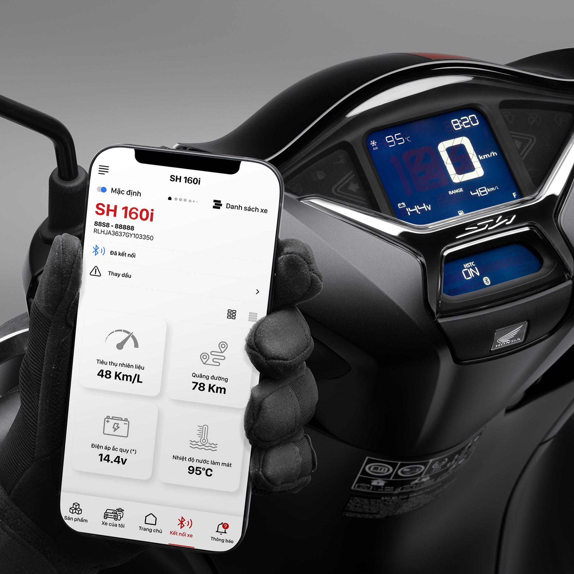 Công nghệ bluetooth kết nối với điện thoại thông minh tiếp tục được trang bị trên SH160i. Khi kết nối qua Bluetooth với ứng dụng My Honda+, khách hàng có thể đọc toàn bộ các thông tin xe như tình trạng vận hành, thông tin sửa chữa, bảo dưỡng, bảo hành, lịch sử và bảng xếp hạng tiêu hao nhiên liệu, thông tin các sản phẩm mới hoặc sự kiện của HVN. (*) Chức năng được trang bị trên phiên bản SH160i. Vui lòng đọc kỹ sách hướng dẫn sử dụng xe để đảm bảo an toàn.