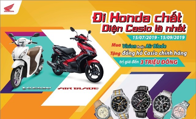 Rinh quà hấp dẫn cùng Honda VISION 110cc & Air Blade 125cc - “Đi Honda chất. Diện Casio là nhất” -” Hà Nội, ngày 15 tháng 7 năm 2019, Công ty Honda Việt Nam (HVN) thực hiện...
